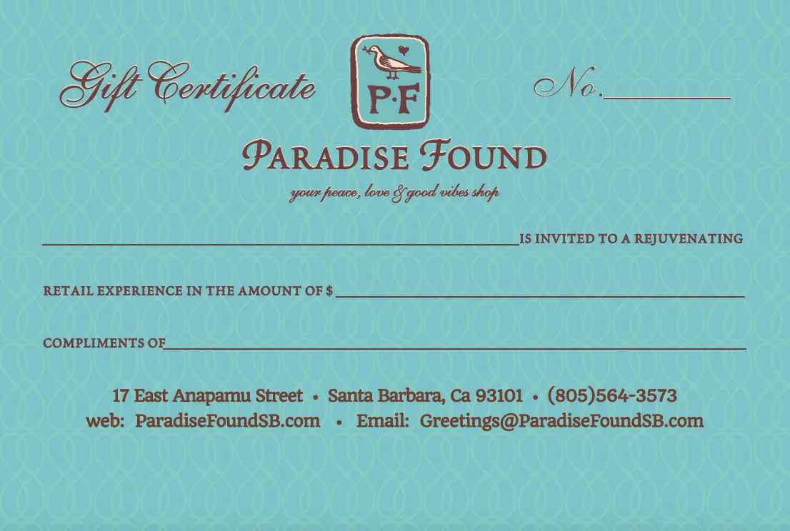 Shopping for someone else but not sure what to give them? Give them the gift of choice with a Paradise Found Gift Certificate. Your Gift Certificate will be delivered to your recipient via email. Your Gift Certificates may now be redeemed in person at our shop or on our online shop, excluding Bookshop.